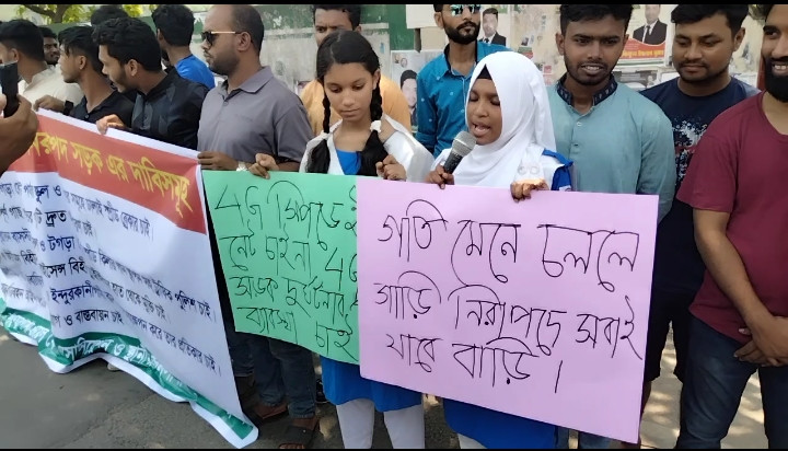 ঝুঁকিমুক্ত পরিবহন ও নিরাপদ সড়ক চাই দাবিতে মানববন্ধন