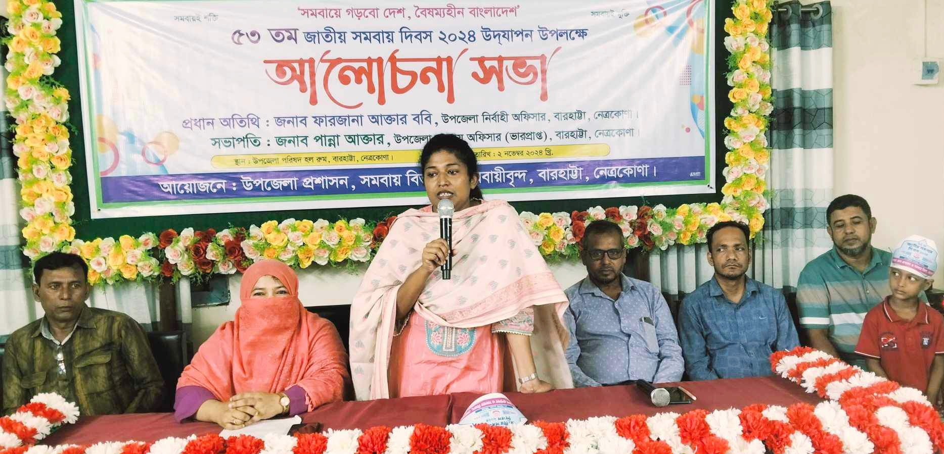 র্যালী শেষে উপজেলা প্রশাসন, সমবায় বিভাগ ও সমবায়ীবৃন্দের যৌথ উদ্যোগে উপজেলা পরিষদের অস্থায়ী হলরুমে সাংবাদিক লতিবুর রহমানের সঞ্চালনায় ও উপজেলা সমবায় কর্মকর্তা (ভারপ্রাপ্ত) পান্না আক্তারের সভাপতিত্বে আয়োজিত অনুষ্ঠানে প্রধান অতিথি হিসেবে উপস্থিত ছিলেন, বারহাট্টা উপজেলা নির্বাহী কর্মকর্তা (ইউএনও) ফারজানা আক্তার ববি। অন্যান্যদের মধ্যে সাংবাদিক রোকনুজ্জান, সাংবাদিক আফজল হোসেন, দরুন সাহতা সার্বিক গ্রাম উন্নয়ন সমবায় সমিতির উন্নয়ন কর্মী শিরিন আক্তার, চাকুয়া সার্বিক গ্রাম উন্নয়ন সমবায় সমিতির উন্নয়ন কর্মী ফিরোজ উদ্দিন শেখ, ভাটগাঁও সার্বিক গ্রাম উন্নয়ন সমবায় সমিতির উন্নয়ন কর্মী মোঃ মহিবুর রহমান বক্তব্য রাখেন। এছাড়াও আলোচনা সভায় সুশীল সমাজের লোকজন, সমবায় সমিতির সদস্যবৃন্দসহ বিভিন্ন প্রিন্ট ও ইলেকট্রনিক মিডিয়ার সাংবাদিকবৃন্দ উপস্থিত ছিলেন।