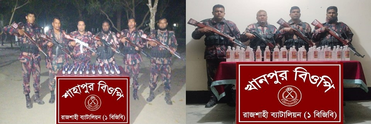 এছাড়াও তিনি জানান ১ বিজিবি রাজশাহী সীমান্তে অভিযান পরিচালনা করে ১টি ইঞ্জিন চালিত নৌকাসহ মাদকদ্রব্য জব্দ করেছে। গত সোমবার দিনগত রাতে শাহাপুর বিওপি টহলদল কাটাখালী থানার শাহাপুর পুর্বপাড়ার একটি গম ক্ষেতে ওৎ পেতে থাকার এক পর্যায়ে ১জন ব্যাক্তিকে আনাগুনা করতে দেখে তাড়া দিলে ওই ব্যাক্তি একটি ব্যাগ ফেলে রাতের আধারে কৌশলে পালিয়ে যায়। তাৎক্ষনিক বিজিবি সদস্যরা ফেলে যাওয়া ব্যাগটি তল্লাশী করে ৫০ বোতল ভারতীয় ঊঝকটঋ সিরাপ জব্দ করে ।